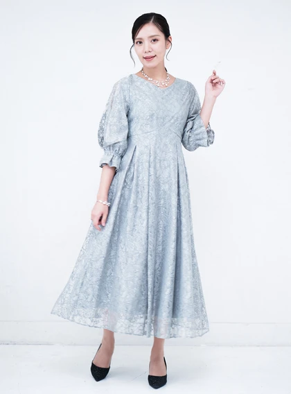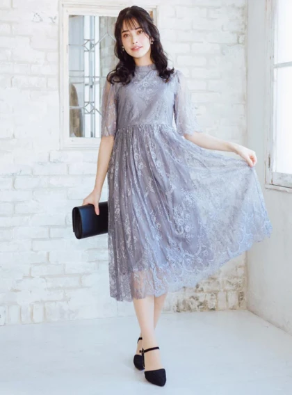 ドレスとアクセサリー2~3点、羽織りまたはサブバッグが含まれたWeb限定のセット商品です。ワンピースは上品さと華やかさがある繊細な総レースです。ドレスはブルーグレー・アーミーブルー・パープルの3色展開で、サイズとカラーは自由に選べます。プロが選んだトータルコーディネートが手軽に揃うおすすめのセットです。