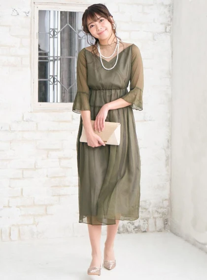 ミモレ丈のワンピースやセットアップは上品で落ち着きある雰囲気を演出しやすく、婚活パーティーにも適したアイテムです。Iラインやウエストマークのあるドレスを選べば、体型をさりげなくカバーしつつラインがきれいに見えます。