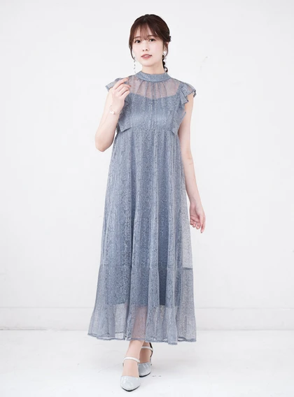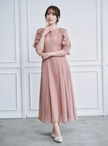 袖のフリルが目を引くフレアドレスです。首の後ろ部分がVネックになっており、後ろ姿にもさりげないフェミニンさが感じられます。シアー素材とフレア裾のやわらかな動きで品のよさが漂います。ウエストは後ろに付いているリボンで調節が可能です。