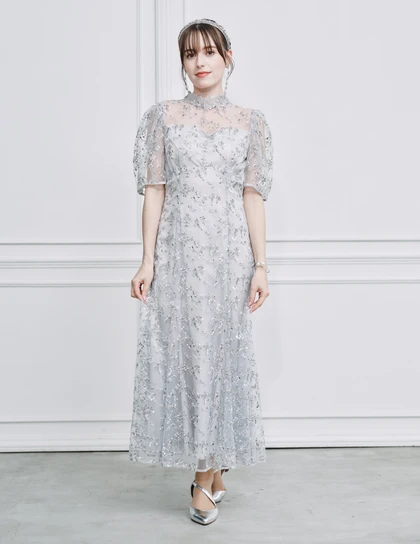 草花の刺繍がちりばめられたバックリボンのロングワンピースドレスです。ハイネックとほどよいボリュームのパフスリーブが品のよさを醸し出します。ウエストラインが高めに設定されているため、スラリとした印象に見えます。