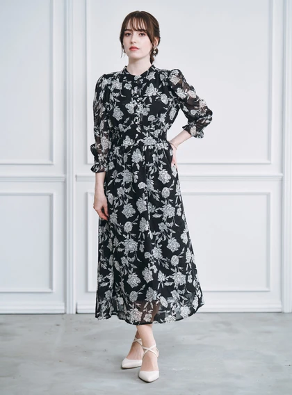 バラ柄のジャガードプリントを全面に使用したワンピースドレスです。パール調の飾りボタンと首元まで覆ったデザインが、清楚で華やかな雰囲気を演出します。パーティーの他、デートや食事会などのデイリーでも着用できます。