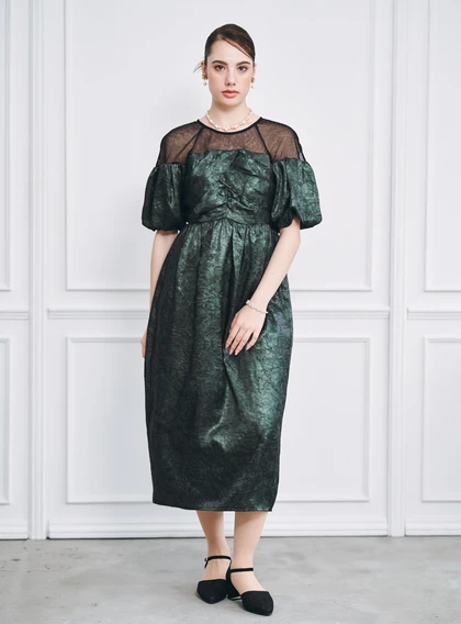 ジャカード素材のワンピースと、スパンコールがあしらわれたレースビスチェを重ねたドレスです。たっぷりとギャザーが入ったスリーブがフェミニンな印象を与えます。ブラック・マスタード・ミントの3色から選べ、どのカラーも上品で優美な色味です。