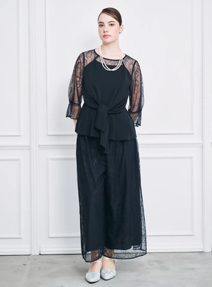 やわらかいシフォンジョーゼットと繊細なレースを組み合わせたブラウスとパンツの2点セットです。トップスとワイドパンツには同じレース素材が使用されており、洗練された華やかさのある雰囲気がまとえます。ブラウス・パンツともにゴム仕様なので着脱しやすく快適な着心地です。
