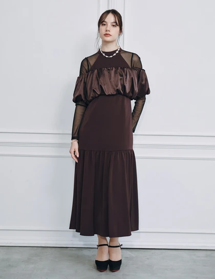 キャミソールドレスの上にアシンメトリーのブラウスを重ねたドレスです。オーガンジー素材で形作られたブラウスのラッフルフリルは、ハリがあるため形が立体的できれいに見えます。キャミドレスはロングですっきりとしたシルエットのため、品よくモードに着こなせます。