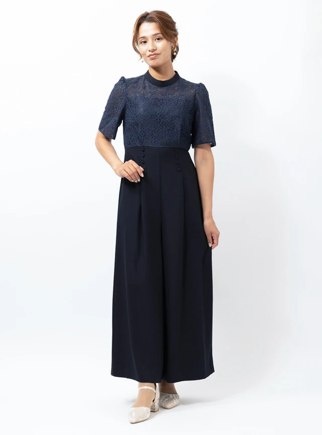 2wayで着用できるエプロンタイプのワンピースドレスです。足首まで届くロング丈が、高身長さんのすらりとしたシルエットをエレガントに見せます。レースの上品なデザインが、華やかなお祝いの席にぴったりな一着です。