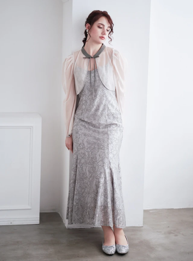 レースのショートボレロとワンピースがセットになったドレスです。3wayで着用できるため、会場の雰囲気に合わせてコーディネートを変えられます。肩紐はアジャスター付きなので、身長に合わせて着丈を微調整できます。ワンピースのマーメイドラインがフェミニンな魅力を引き立てる一着です。