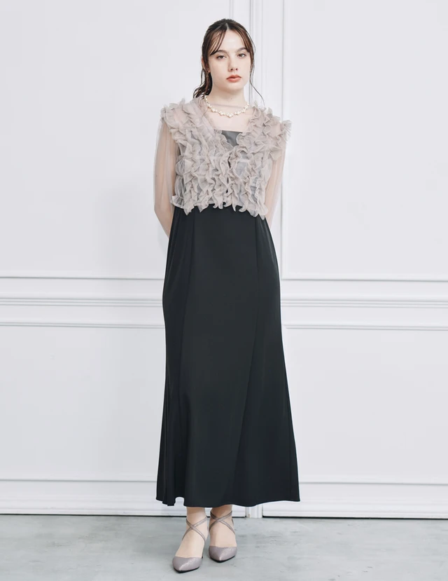 チュールベスト・キャミワンピース・シアートップスがセットになったドレスです。会場の雰囲気に合わせてさまざまな着こなしを楽しめます。小物なしでも存在感を放ち、周りと被らない個性を演出できます。高身長さんのすらりとしたスタイルを活かして、颯爽と着こなせる一着です。