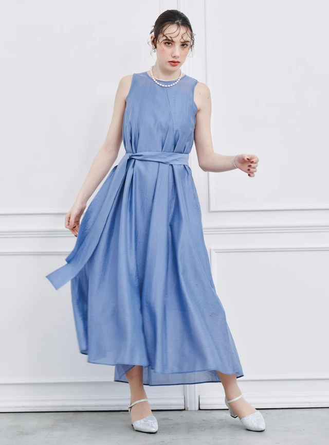 シアー感のある素材が動くたびに揺れて、エレガントな雰囲気を感じさせるワンピースです。付属のリボンベルトは、ウエストマークを作ったり、スカーフタイのように首に巻いたりと、さまざまな着こなしを楽しめます。肌の露出が気になる際は、ストールやボレロを合わせるのがおすすめです。