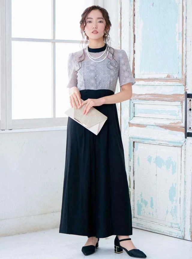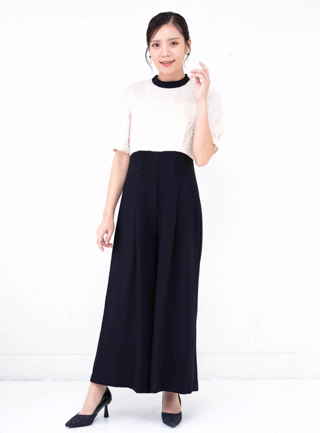 立体的な花柄のレース刺繍がフェミニンな雰囲気のあるオールインワンです。ウエストの切り替え位置にくるみボタンが施されていて、縦ラインを強調しスタイルよく演出してくれます。バイカラーのデザインでも、レースやサテンなどの上質な素材を選べば、結婚式に着用しても問題ありません。