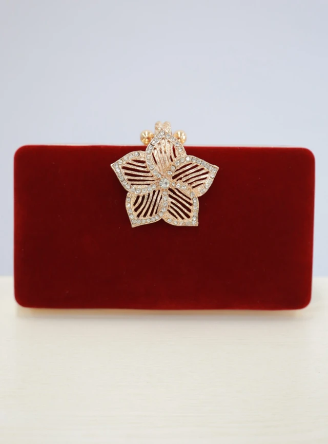 ベロア特有のツヤ感が魅力的なクラッチバッグです。フラワーモチーフのビジューが施されていて、キラキラとした輝きが高級感を演出します。シンプルなデザインなので、幅広いパーティードレスに合わせられます。