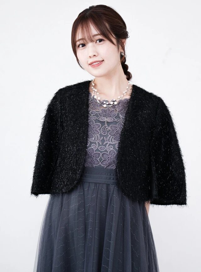 キラキラとしたラメが施された、ケープタイプのボレロです。袖にスリットが入っており、腕を動かしやすくデザインされています。厚みのあるジャガード生地のため、秋・冬の季節におすすめです。