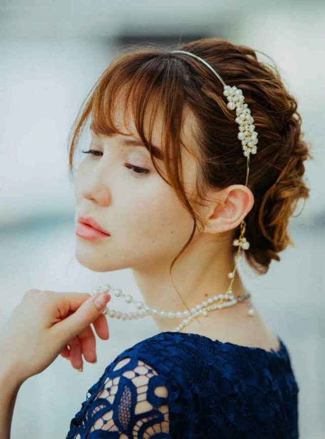 パール付きのカチューシャとヘアーチャームが揃ったアクセサリーセットです。カチューシャはヘアスタイルに合わせて、自分好みの位置に着用できます。ヘアーチャームは髪の毛に巻きつけるだけで装着可能で、華やかなヘアアレンジが完成します。