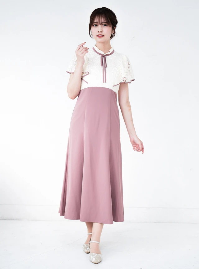 バイカラーのデザインがおしゃれ見えする、ルルティオリジナルのパーティードレスです。フレア袖はヒラヒラとした軽やかな動きが出て、フェミニンな雰囲気を演出します。ウエスト部分は後ろ側にゴムが入っているため、締め付け感が少なく快適に過ごせます。