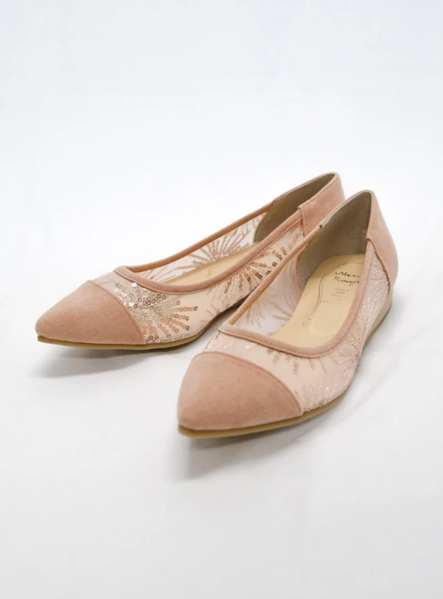スエードとチュールの異素材を組み合わせたフラットシューズです。チュール部分にスパンコールが施されていて、足元に上品な輝きを添えてくれます。歩きやすさを重視したフォーマルシューズをお探しの方におすすめです。