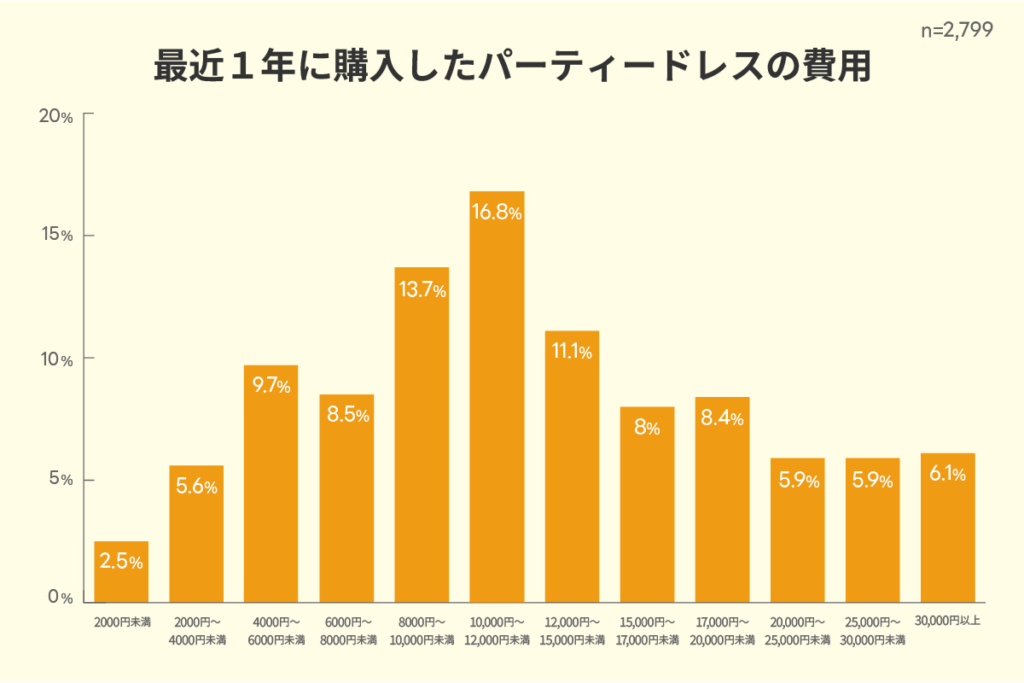 株式会社クロスマーケティングが実施した「最近1年に購入したパーティードレスの費用(n=2799)」の調査(※)では、ドレス購入にかかる費用は全体平均で13,021円でした。ドレス購入費用のボリュームゾーンは、10,000円〜12,000円未満(16.8%)です。