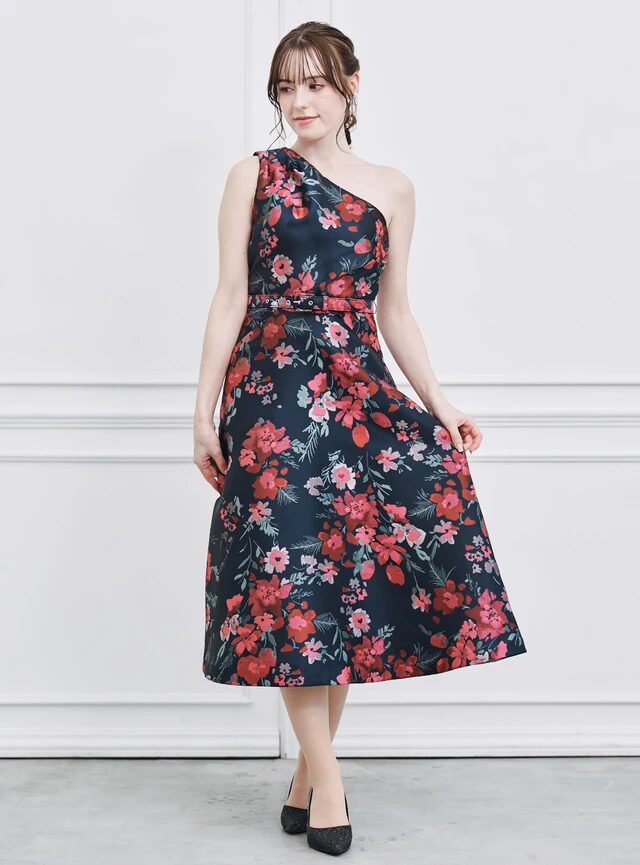 ワンショルダーのアシンメトリーなデザインが特徴的なパーティードレスです。ジャガード生地は程よく厚みがあり、高級感を演出してくれます。ウエストマークが高い位置にあり、スタイルアップもできる1着です。