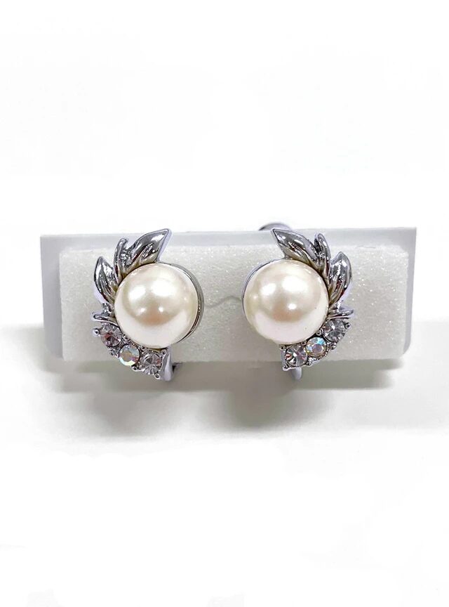 大粒のパールにリーフモチーフが施されたイヤリングです。大きすぎないサイズ感で、耳元に華やかさをプラスしてくれます。留め具はネジバネ式で、ネジを回してしっかりと固定できるため安心です。