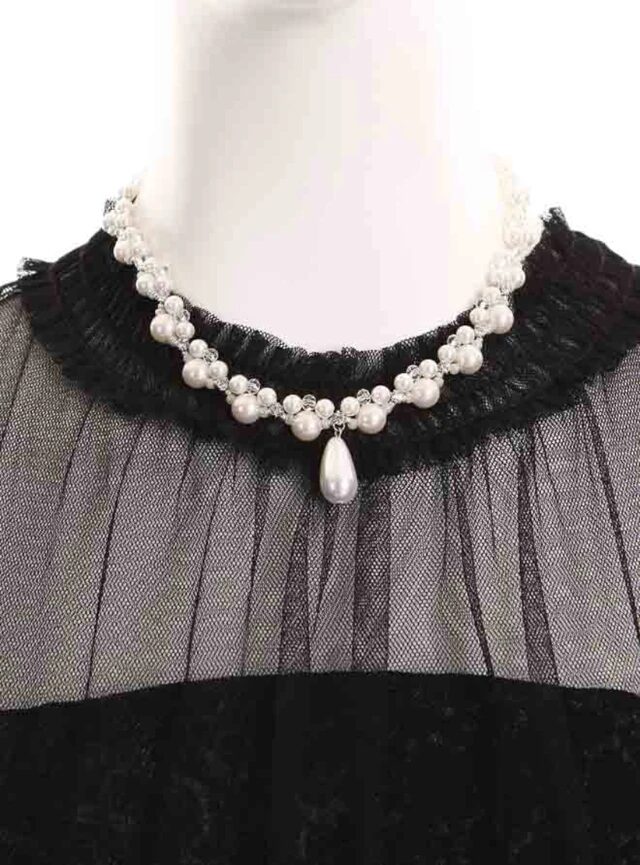 大きさの異なるパールをふんだんに使用した、華やかなネックレスです。マグネット式の留め具を使用しているため、一人でも楽に着脱できます。デコルテが開いたデザインだけでなく、首まわりがシンプルなデザインのドレスにも似合います。