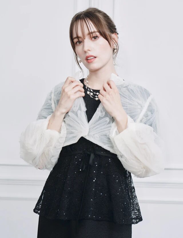 チュールの柔らかな透け感が特徴的な、七分袖のボレロです。立体感のあるフラワー柄は、コーデに華やかさをプラスしてくれます。アイボリーとブラックの2色があり、ドレスのデザインに合わせて選べます。