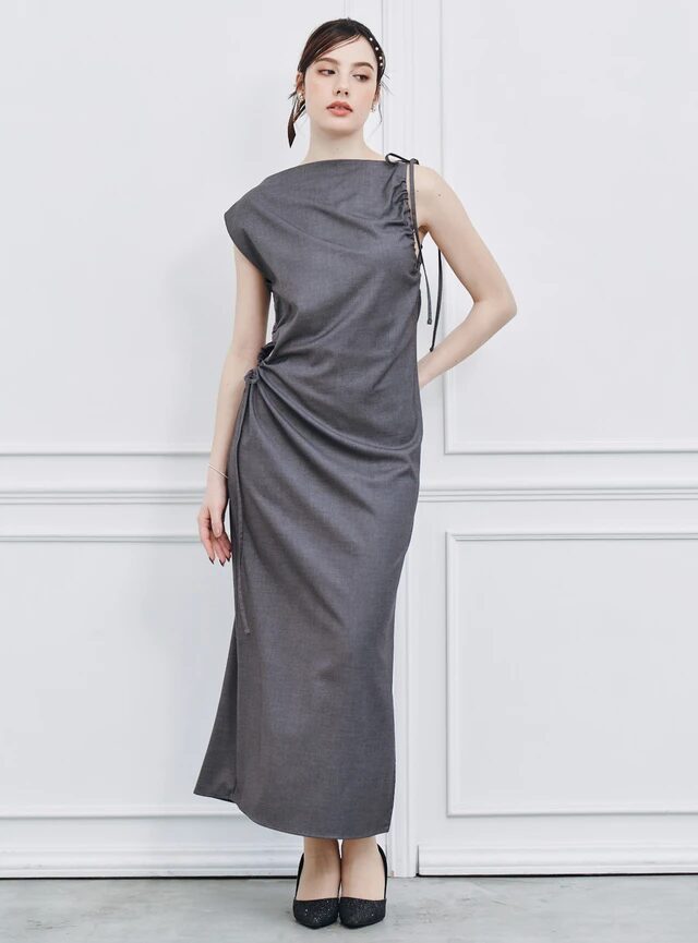 ドロストリボンのアシンメトリーなデザインが、モード感のあるパーティードレスです。ワンショルダーとしても着用でき、2Wayの着こなしを楽しめます。スカートはスリットが入っていて、タイトなシルエットながらも歩きやすい1着です。