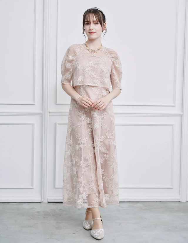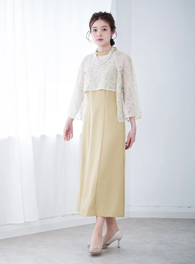 オーガンジー刺繍をほどこしたケープデザインのトップスにIラインワンピースを合わせたドレスです。トップスはインナーとしてもボレロとしても使える便利なデザインで、スリット入りの袖が抜け感を演出します。落ち着いたデザインがお祝いの席にぴったりな一着です。