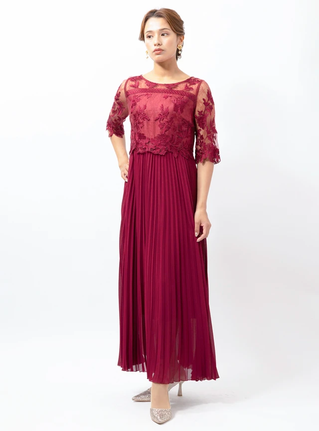 肌触りのよいシフォン素材を使用したワンピースドレスです。花柄刺繍が入ったシアー感のあるレースが、デコルテラインをきれいに見せます。エレガントに揺れるプリーツスカートが上品な印象を与える一着です。