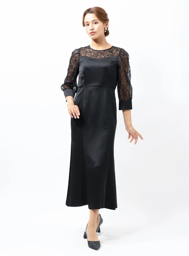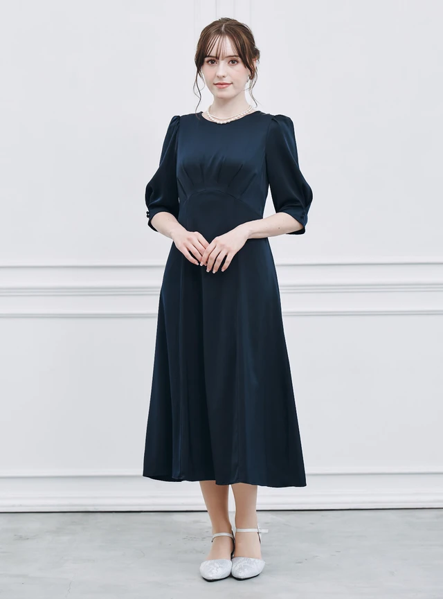 マーメイドラインがスタイルを美しく見せるワンピースドレスです。程よくふくらんだ6分丈の袖とウエストを細く見せる美しいラインが、フェミニンな印象を与えます。光沢感のあるサテン素材が歩くたびに輝き、エレガントな雰囲気を演出する一着です。