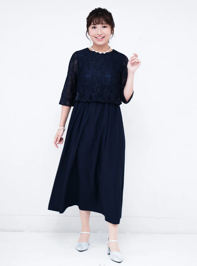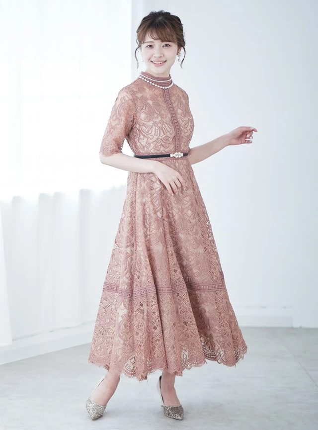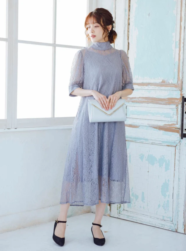 繊細な総レースが華やかなワンピースドレスです。首元とウエストのハシゴレースの切り替えが清楚な印象を与え、脚長効果も抜群です。ウエストはゴム仕様のため、締め付け感がありません。幅広い世代の方がストレスなく着用できる一着です。