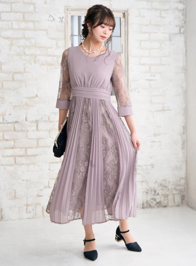 シフォン素材のプリーツとレースを組み合わせた、やわらかさの感じられるワンピースドレスです。ハイウエストのデザインで、脚長効果が期待できます。袖が付いているため、フォーマルな場でも一枚で着られる上品な一着です。