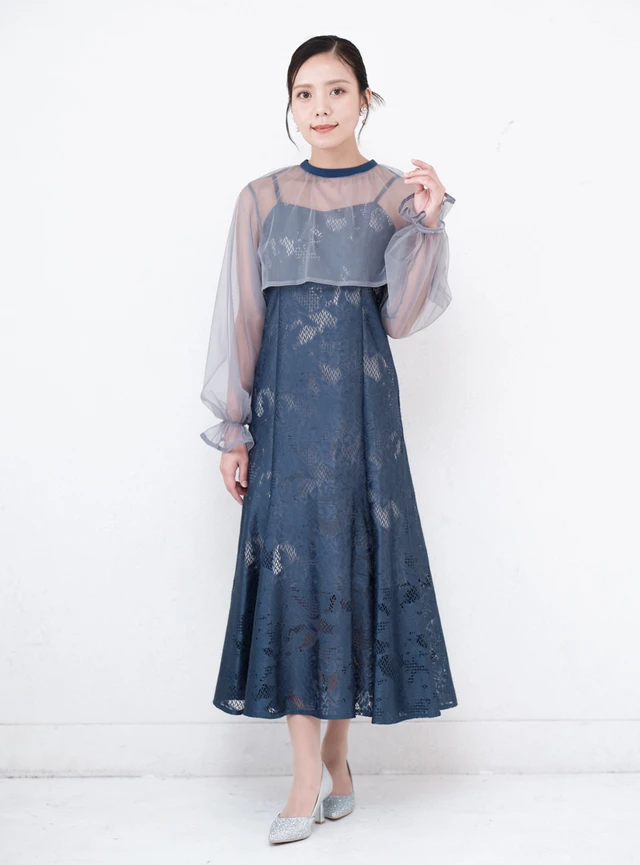 ジャガードレースのマーメイドドレスにシアー感のあるブラウスを合わせた一着です。マーメイドドレスが、縦のラインをすっきりと見せます。ブラウスは羽織りとしてもインナーとしても着用でき、場面に合わせて着こなしを変えられます。