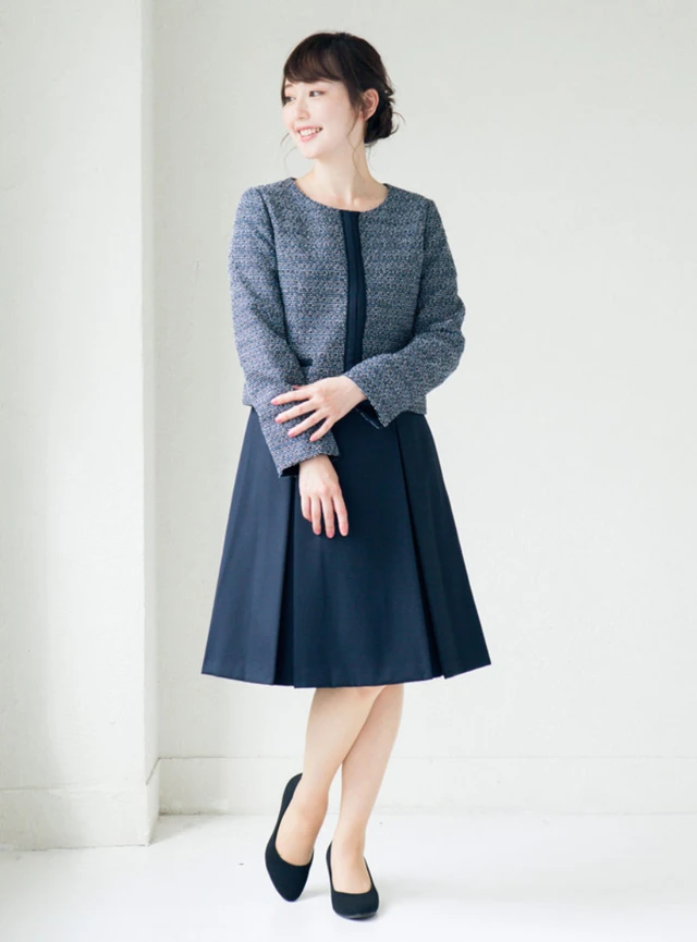 先染めノーカラージャケットとワンピースのアンサンブルです。ワンピースはウエストで切り替えられているため、体型をさりげなくカバーできます。華やかなシーンからオフィスまで、幅広く着回せるシンプルで上品なデザインです。
