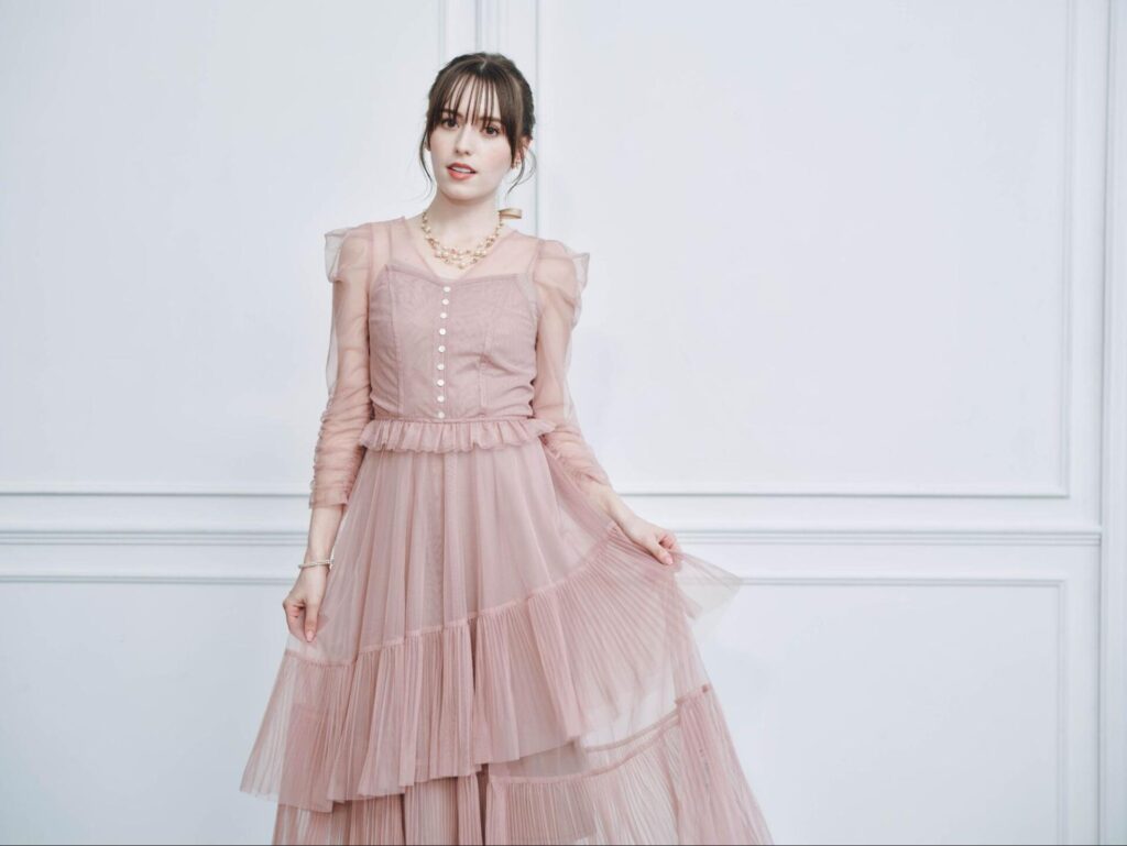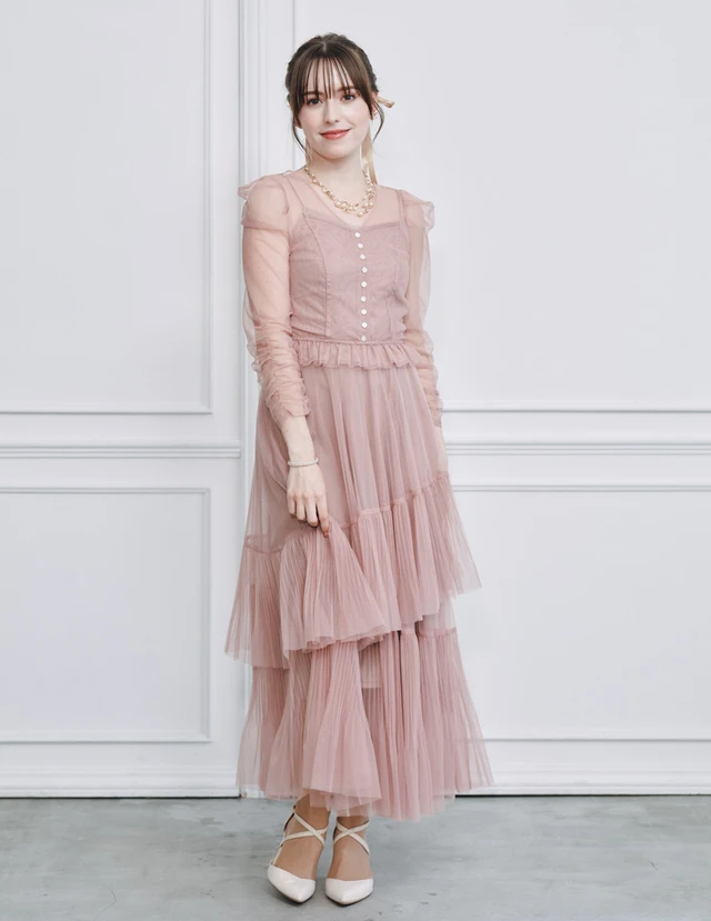 繊細なシアー素材をふんだんに使用した高級感のあるワンピースドレスです。アシンメトリーなティアードデザインのスカートが歩くたびに華やかに揺れ、エレガントな印象を与えます。20代のフェミニンな魅力を引き出せる一着です。