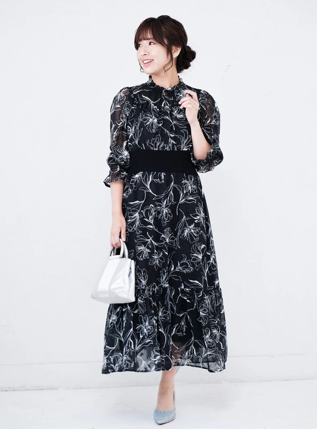 大柄の花柄が可憐なシフォンワンピースドレスです。透け感のある長袖デザインが、二の腕をカバーしつつ軽やかな印象を与えます。少しカジュアルダウンした雰囲気は、パーティーや食事会に最適な一着です。