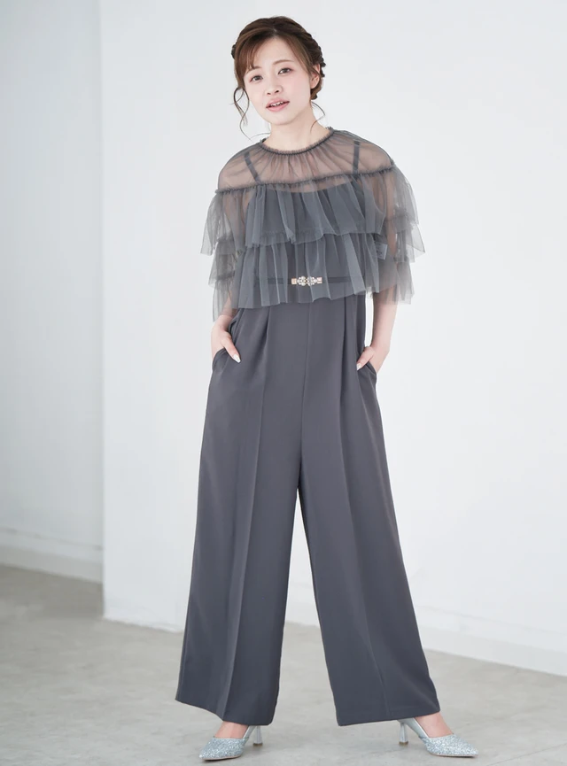繊細なチュールブラウスとキャミオールインワンがセットになったパンツドレスです。ブラウスにほどこされたギャザーフリルのティアードデザインが、フェミニンな魅力を引き出します。高めのウエスト切り替えとアジャスター付きの肩紐で、スタイルアップを叶えつつ自分に合った着丈に調整可能です。