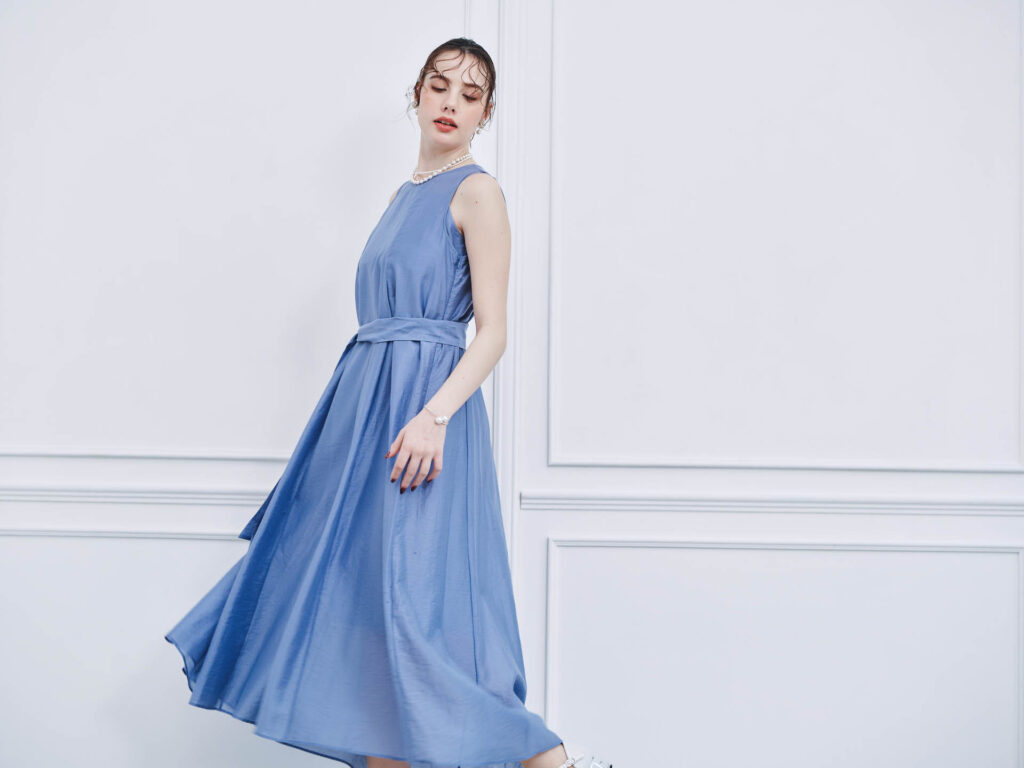 サテン生地が上品さを感じさせるワンピースドレスです。ふわりと広がるフレアスカートは歩くたびに揺れ、エレガントな印象を与えます。光沢のある生地が高級レストランのディナーにぴったりな一着です。
