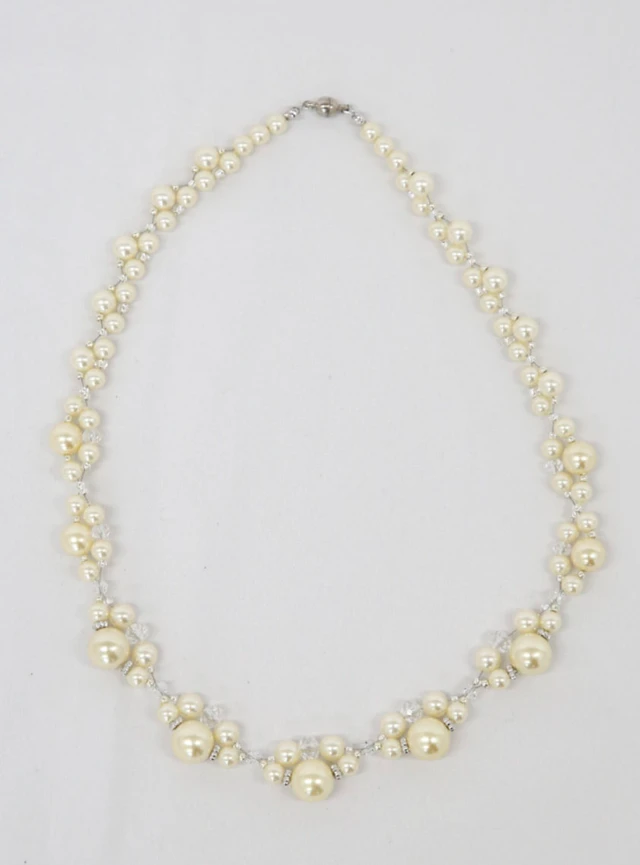 プラパールとガラスをちりばめたネックレスです。シンプルで上品なデザインは、デコルテをさりげなく華やかに彩ります。照明にあたって輝くため、ディナーの席にふさわしい装いに仕上げられます。
