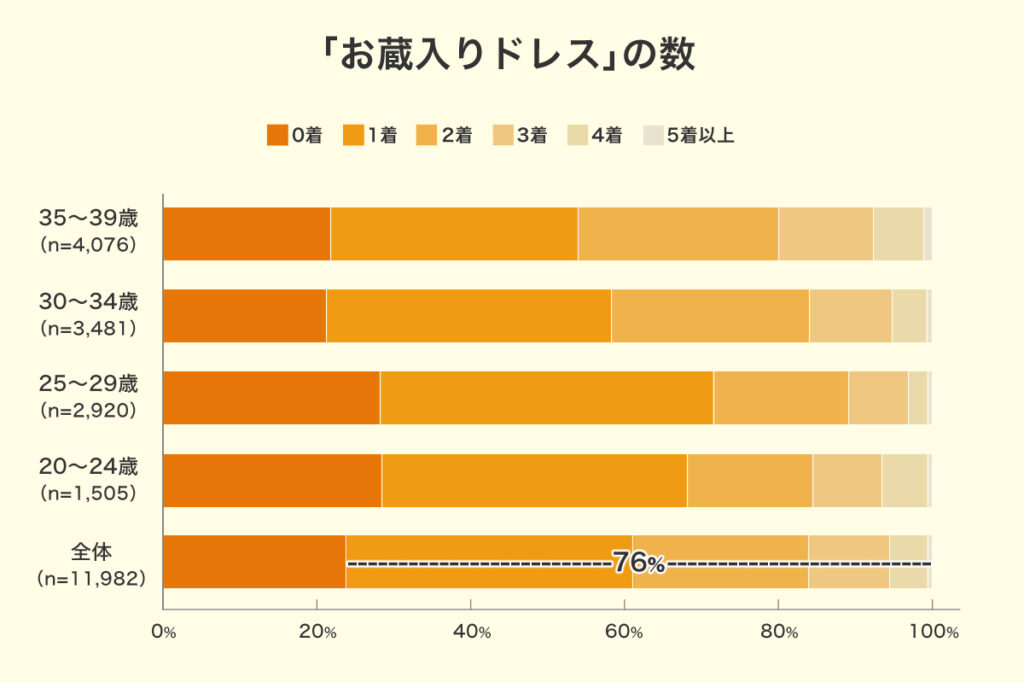 購入後に着ていないお蔵入りドレスを1着以上もつ人は、全体の約76%とのデータもあります(株式会社クロスマーケティング調べ)。ドレスは年齢とともに似合うデザインが変わりやすく、着用シーンも限られるため、無理に購入するよりレンタルのほうが合理的です。