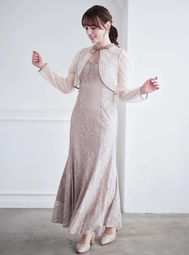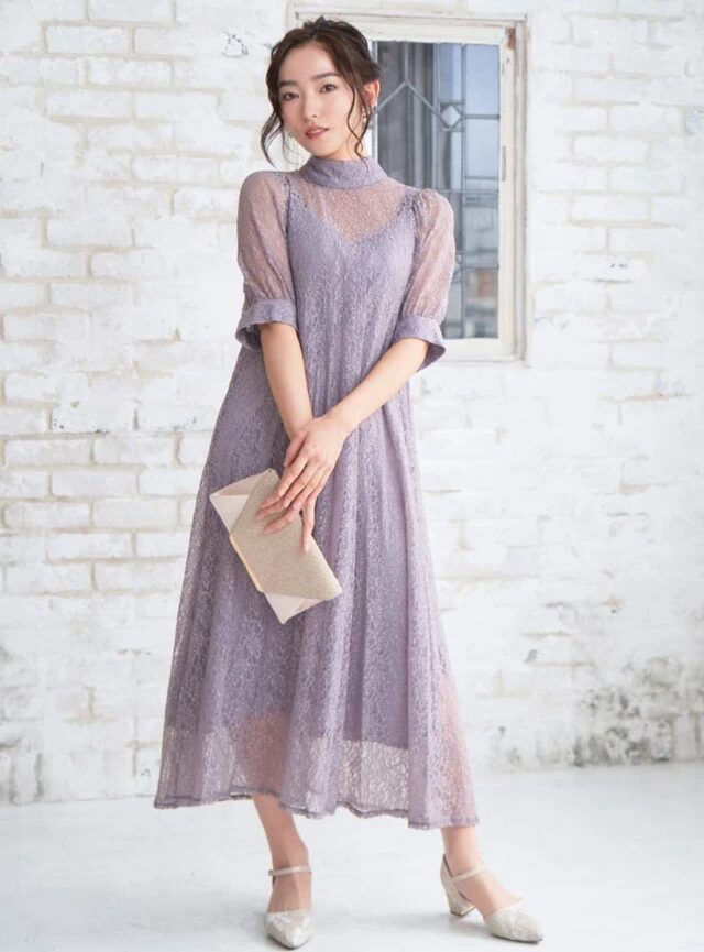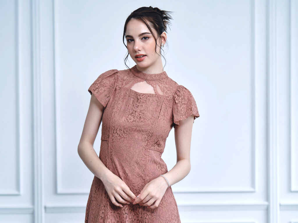 | ピンクベージュ | ・ナチュラルで上品 ・清楚系コーデにピッタリ | ・スタンドカラー ・総レースドレス |