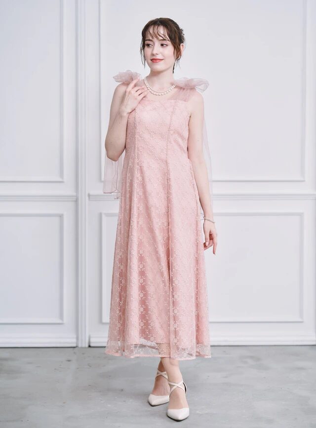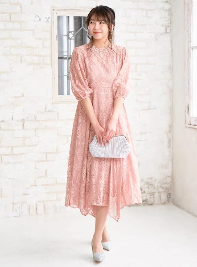 大ぶりの幾何学模様のレースが目を引く、エレガントなワンピースです。かわいらしいパフスリーブが、清楚でやわらかな印象を与えます。ロング丈のシルエットが上品さを引き立て、幅広い世代のお呼ばれシーンになじむドレスです。