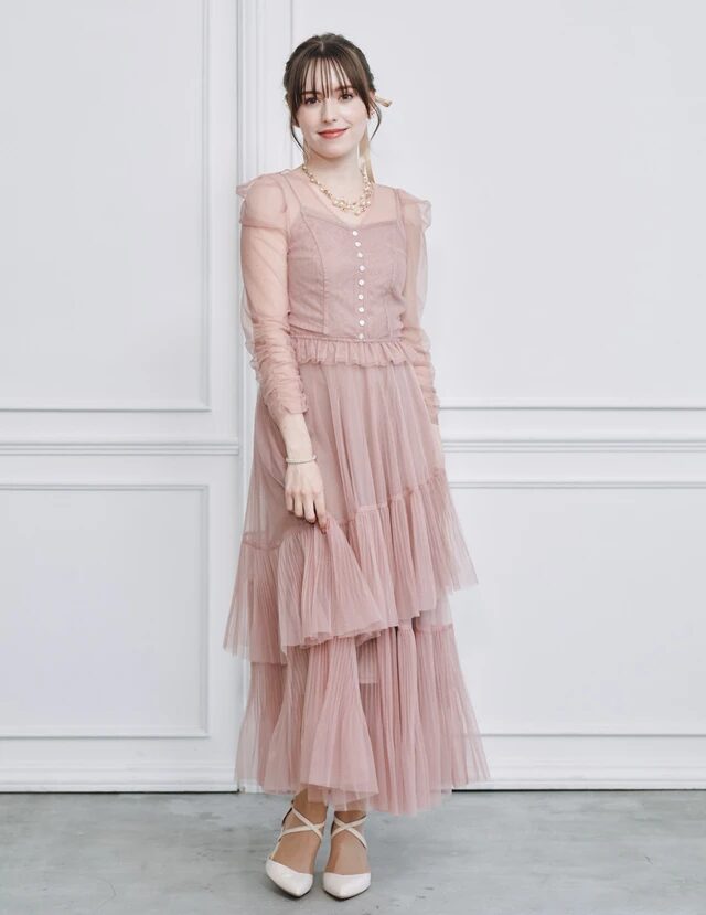 繊細なシアーチュールが軽やかに揺れる、透明感あふれる一着です。ドッキング風デザインとアシンメトリなティアードスカートが華やかさを演出し、高めウエスト切り替えでスタイルアップも叶うドレスです。