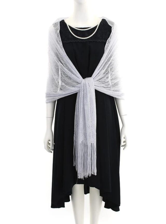 肩掛けや前結びなど、自在にアレンジできるニットストールです。やわらかな素材感で着心地がよく、さまざまなドレスに合わせやすいのが魅力です。結婚式コーデにさりげない品のよさをプラスしたいときに活躍します。