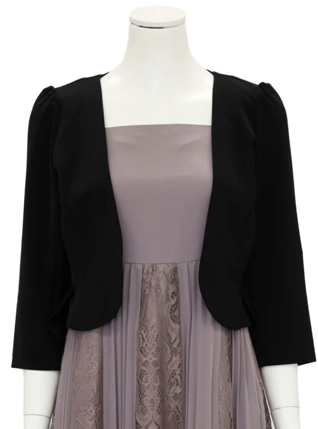 淡いピンクや白っぽく見えやすいピンクベージュのドレスには、ブラックやネイビーの羽織ものを合わせるのが有効です。「白に見えてしまうかも」と不安がある方は、取り入れてみましょう。