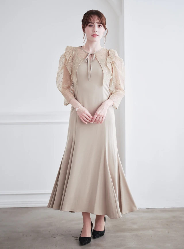 レースのショートボレロとマーメイドラインが印象的なセットドレスです。ボレロの着脱や着こなし次第で3wayのスタイルが楽しめるため、シーンやTPOに合わせたアレンジが可能。ワンピースはすっきりとしたマーメイドシルエットで、歩くたびに美しいラインを強調。肩紐はアジャスター仕様のため、体型に合わせて細かな調整ができるのも嬉しいポイントです。