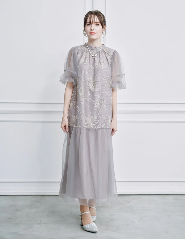 スカラップデザインの首元がフェミニンな印象を与える上品なワンピース。落ち着いたレーストップスと軽やかなチュールプリーツスカートの組み合わせが、華やかさと上品さを両立します。ウエスト部分は総ゴム仕様で、体型を選ばず快適な着心地です。