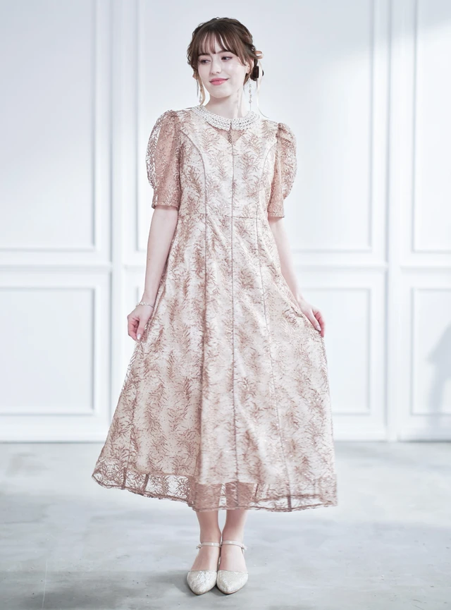 ヴィンテージ感漂うフラワーレースが上品でクラシカルな印象を与えるワンピース。シフォン素材の袖が軽やかさをプラスし、ウエスト部分のタックデザインで自然にスタイルアップを叶えます。落ち着いたトーンのカラーとロング丈が、可憐さと大人らしさを絶妙に両立してくれます。