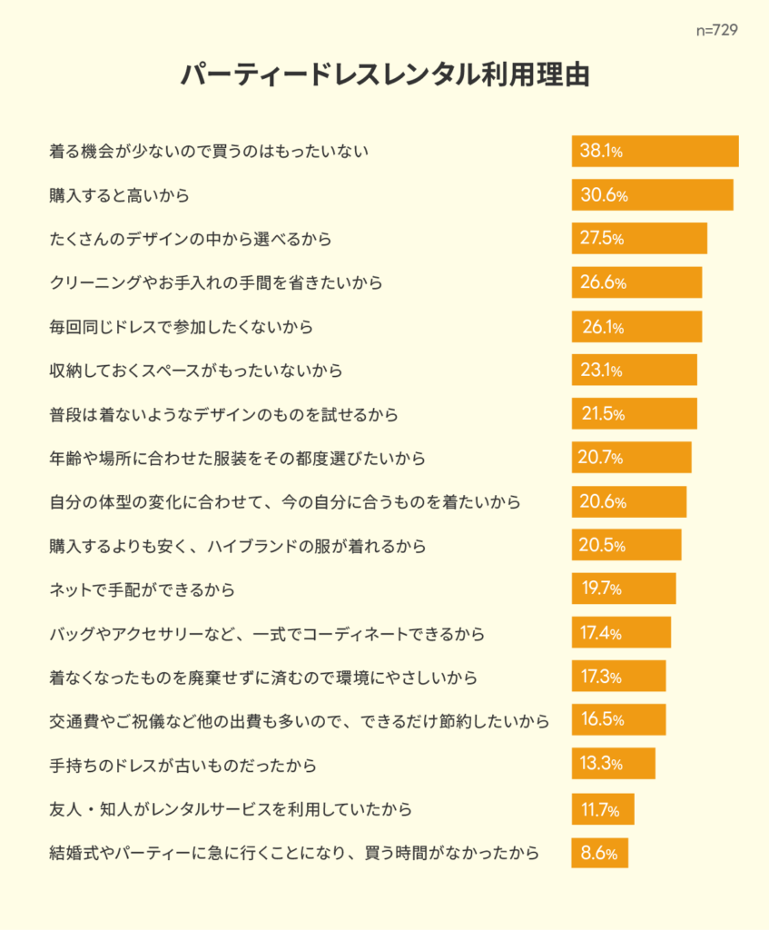 株式会社クロスマーケティングが実施した調査によると「パーティードレスレンタル利用理由」について、792人中38.1%が「着る機会が少ないので買うのがもったいない」、30.6%が「購入すると高い」という結果が出ています。