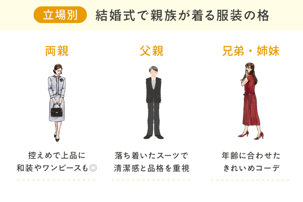 このような事態を防ぐには、事前に新郎新婦が中心となり、両家の服装について確認を取っておくと安心です。たとえば「男性はスーツにネクタイ着用、女性はワンピースまたはセミフォーマルのスーツ」など具体的な服装の指示を共有するとよいでしょう。