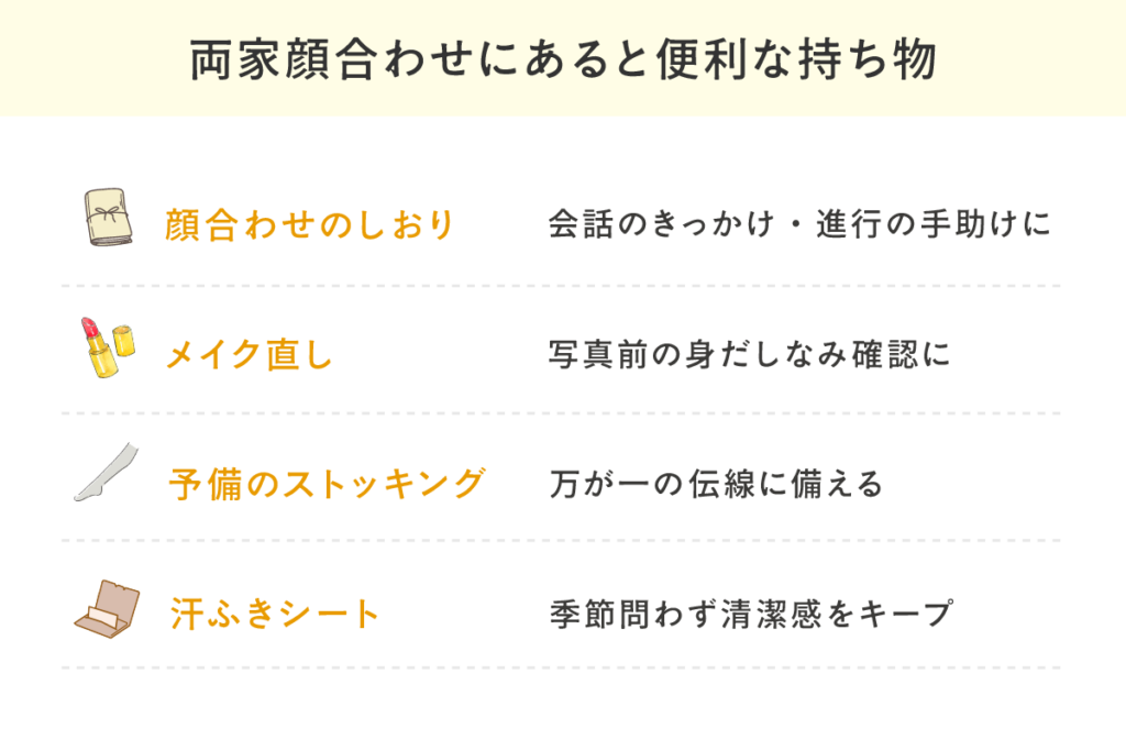 両家顔合わせに持参すると便利な持ち物は以下のとおりです。