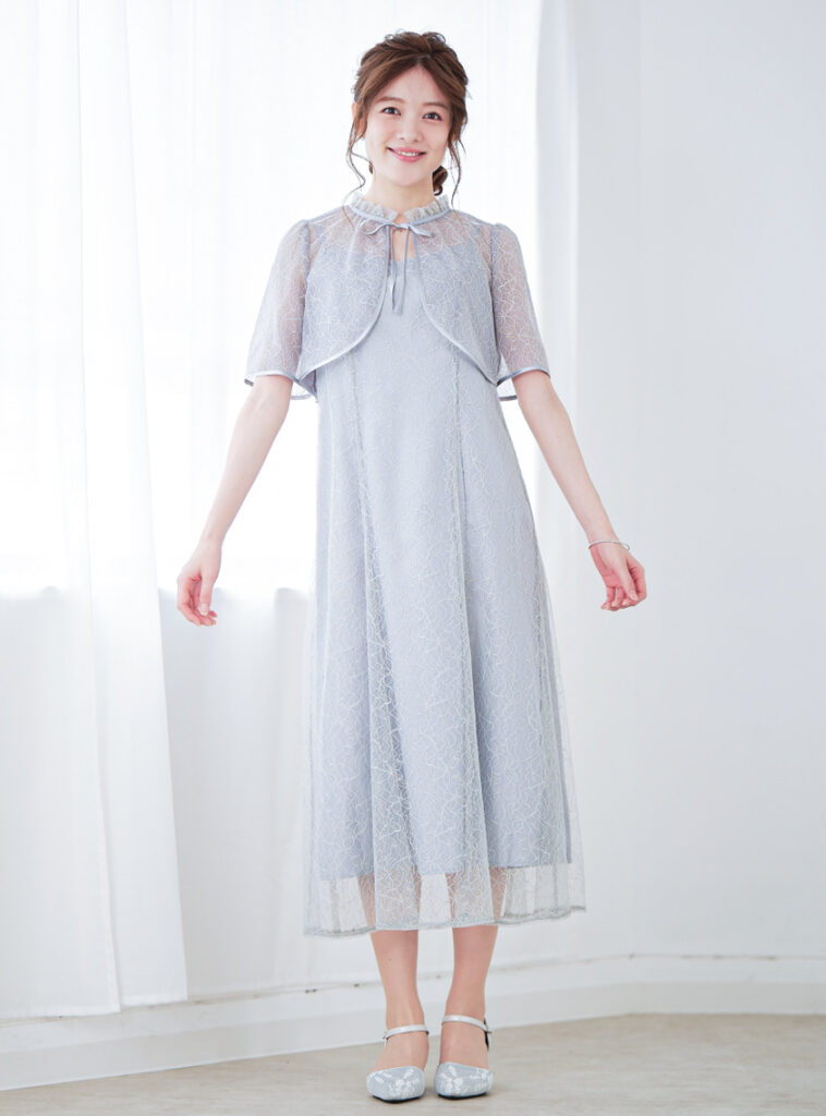 繊細なレースに包まれた、華やかで上品な2way仕様のワンピース。首元のリボンとフリルが顔まわりを優しく引き立て、フェミニンな柔らかさをプラスします。付属のボレロは前後どちらでも着用でき、シーンに合わせたアレンジが可能です。