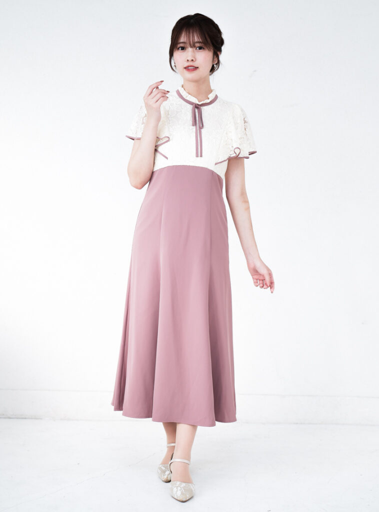 首元のフリルと細リボンが印象的な、ルルティオリジナルのマーメイドワンピース。柔らかなレース素材のトップスに、同色のパイピングをあしらった袖口が上品なアクセントになっています。高めのウエスト切り替えでスタイルアップ効果があり、後ろゴム仕様で着心地も快適。